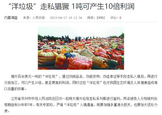 “洋垃圾”走私的利润也可谓惊人。据人民日报此前报道,境外百余美元一吨的“洋垃圾”,通过伪报品名、伪装货物、伪造单证等手段走私入境后,再进行分拣加工,可以产生10倍、甚至更高的利润。同时,这些“洋垃圾”也对我国生态环境及人体健康造成难以估量的伤害。