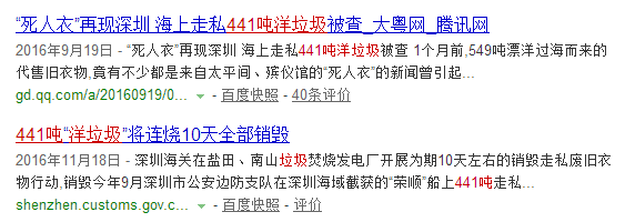 距今最近的一次报道是去年11月,深圳海关集中销毁441吨走私废旧衣物。而在此不久前,深圳边防刚截获了一批549吨重的洋垃圾服装,其数量之大令人震惊。