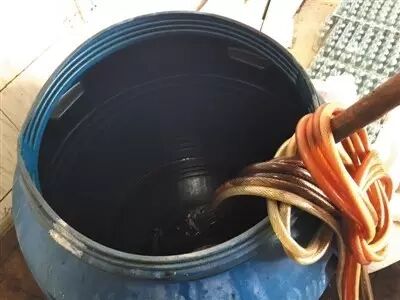 一间杂乱无章的屋子里,角落里立着一个1米多高的深蓝色塑料桶,里面盛着将近一半的酱色液体,一根木棍插在桶内,上面缠着几根已经变色的橡皮管,一直延伸到桶外。