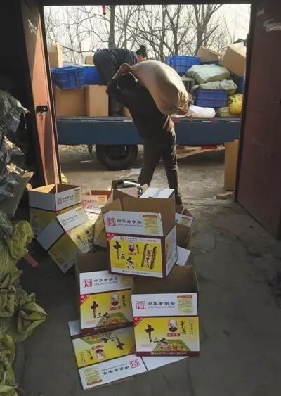 △ 2017年1月11日,天津独流镇七堡村河北一条,假十三香窝点隐藏在一村民家中。查抄中,几位雇来的民工正将假十三香成品、半成品、原料、包装及机器都搬上卡车拉走。
