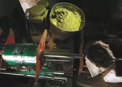 在光线昏暗的倒座房内,放有一台灌装机,机器还散发着热量,口内盛有还未灌装完毕的原料,十三香的包装正在机器上随时等待灌装。在灌装机前方,堆放着20袋左右的原料粉末。