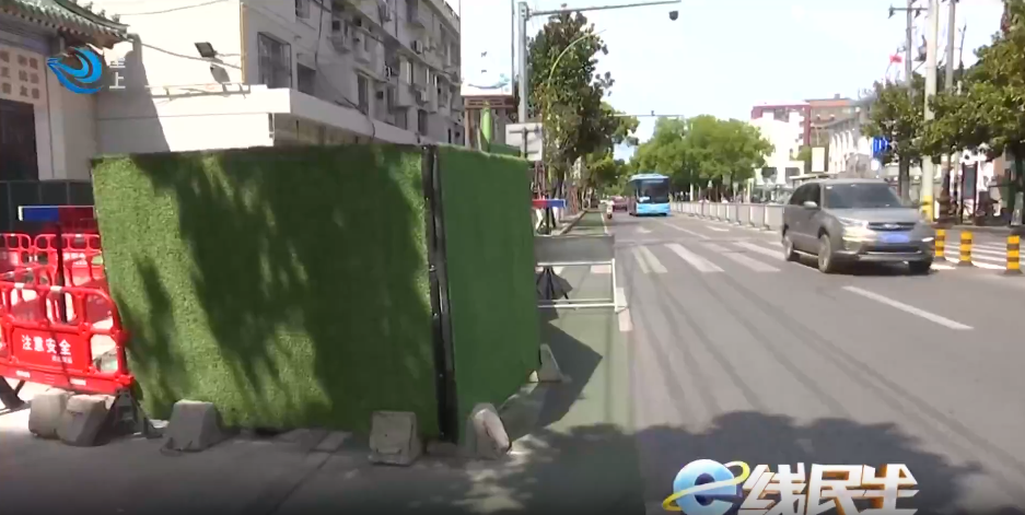在现场,记者看到大门口道路超过一半被围挡遮住,靠近马路边上的围挡高度约在2米,甚至有部分围挡竖在了马路上。记者采访过程中,有车辆进入小区,由于设置围挡道路变窄,大家通过时格外小心。
