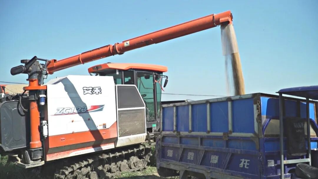 在章田寺乡金红村的制种田间,两台收割机在金色的稻浪中穿梭,饱满的稻穗在机械臂的梳理下迅速脱粒,金黄的稻谷从收割机中倾泻而出,直接装入运输车。