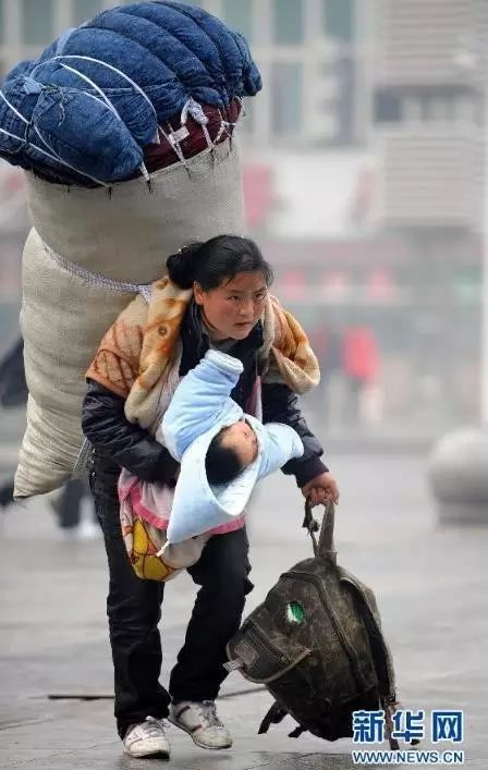 一位背负着超大行李的母亲怀抱孩子在南昌火车站匆忙赶车(2010年1月30日摄)。 新华社记者 周科 摄