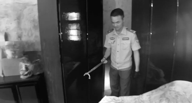 民辅警携带防护装备赶到老人家中,黎某告知蛇藏在衣柜角落。几名民辅警逐一搬动衣柜箱,打开手电查找,发现一条小蛇躲藏在最内侧衣柜的犄角旮旯处。民警用火钳扼住小蛇要害将其抓获,围观群众纷纷为民警点赞。