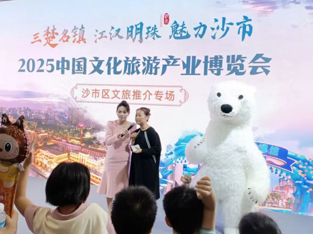 展会现场,沙市展区人气居高不下。金童食品特色饮品获观众青睐,荆州海洋世界、沙市码头文创园推出的创意玩偶,以可爱造型与个性设计跻身“网红”行列,直观展现沙市文旅新风貌。更有荆州海洋世界的北极熊人偶惊喜互动,憨态可掬的姿态引发男女老少合影热潮,现场笑声与快门声交织,气氛持续升温。