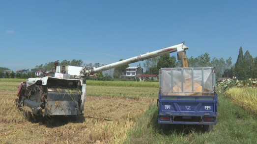 在晏家巷村的水稻种植基地,收割机正开足马力,在这片广袤的金色海洋中来回穿梭。农机手操作熟练,收割机驶过,稻穗应声入仓,随后稻粒则通过传输装置输送至一旁的转运车中,实现高效协同作业,跑出秋收“加速度”。在完成水稻收割后,秸秆也将进行统一打捆处理,做好秸秆综合利用工作的同时,进一步拓展农业附加值,为村民增添一份实实在在的收入。