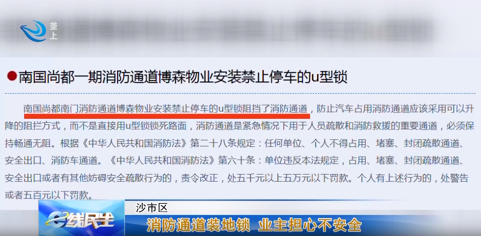 最近,有市民在我们栏目平台发帖反映,说他们小区消防通道被物业公司用地锁挡住,认为地锁可能阻碍消防车通行,存在安全隐患。