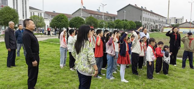 参观结束后,一场庄严的少先队宣誓仪式在广场举行。孩子们佩戴鲜艳的红领巾,面向少先队队旗肃立。在村关工委主任的领誓下,大家高举右拳,用洪亮的声音宣誓,激昂的誓言回荡在现场,不仅是对少先队精神的传承,更让孩子们在仪式感中坚定了“听党话、跟党走”的信念。