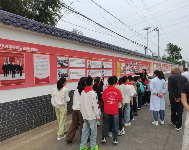 活动伊始,在村关工委工作人员与“五老”代表的共同带领下,孩子们来到村内精心打造的延安精神长廊,长廊以图文并茂的形式,生动展现了延安时期的历史背景、重要事件与精神内涵——从“自己动手、丰衣足食”的南泥湾大生产运动,到“实事求是、艰苦奋斗”的延安作风,再到无数革命先辈为理想信念拼搏奉献的感人事迹。工作人员化身“红色讲解员”,用孩子们听得懂、感兴趣的语言,逐幅讲解画面背后的故事,不时与孩子们互动提问:“大家知道为什么战士们要自己种地吗?”“我们现在的幸福生活和延安精神有什么关系呀?”孩子们纷纷举手抢答,在问答中加深了对延安精神的理解,眼神中满是对革命先辈的敬佩。