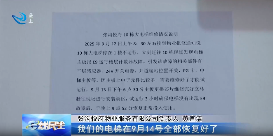 张沟悦府物业服务有限公司负责人 黄直清:我们的电梯在9月14日全部恢复好了,恢复好以后,市场监管局来检查的,并且乘坐了几次,都是完全恢复了,我们的电梯维保公司,我让他们先检查这两部电梯,在十一前,把小区的36部电梯检测一次。