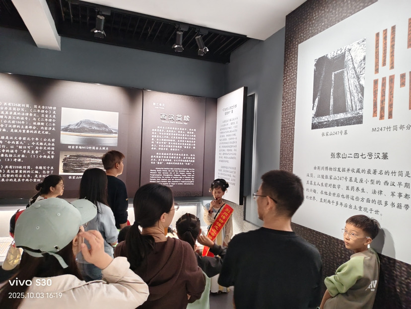 “您好,请在对面陈列楼排队等候,等会2:30,我将为各位游客开展志愿讲解!”在荆州博物馆入口处,志愿者许凤江正耐心引导游客,同步告知志愿讲解等温馨提示。作为荆州博物馆志愿讲解员,她每天提前到岗、延迟离岗,与同伴化身“文物观览引领员”,分4个时段带领游客走近荆州博物馆各个展厅,讲述楚文化的千年脉络。