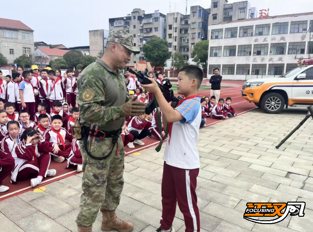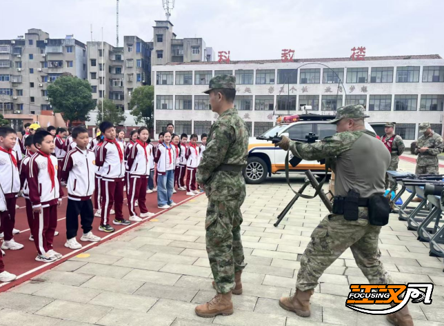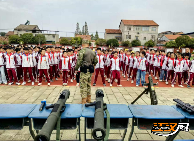 军事装备体验环节,更是点燃了学生们的热情。在战术装备讲解现场,教官手持迷彩战术背心,逐一介绍战术口袋、护具的功能用途,“这不仅是装备,更是军人在战场上的‘防护盾’!”而当教官带来枪械、迫击炮讲解时,学生们纷纷踮起脚尖、睁大眼睛。“大家注意看炮管角度,这直接影响射程!”在教官的指导下,学生们轮流上前,双手紧握迫击炮模拟炮筒,调整角度、模拟发射,每一次“击发”都伴随着兴奋的欢呼,真切感受军事装备的魅力。