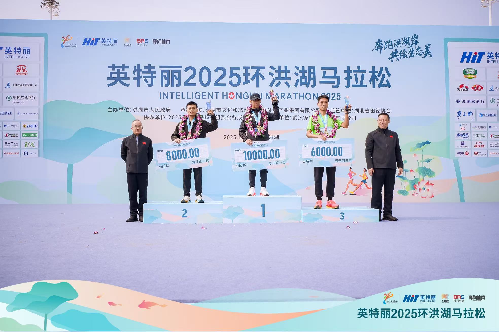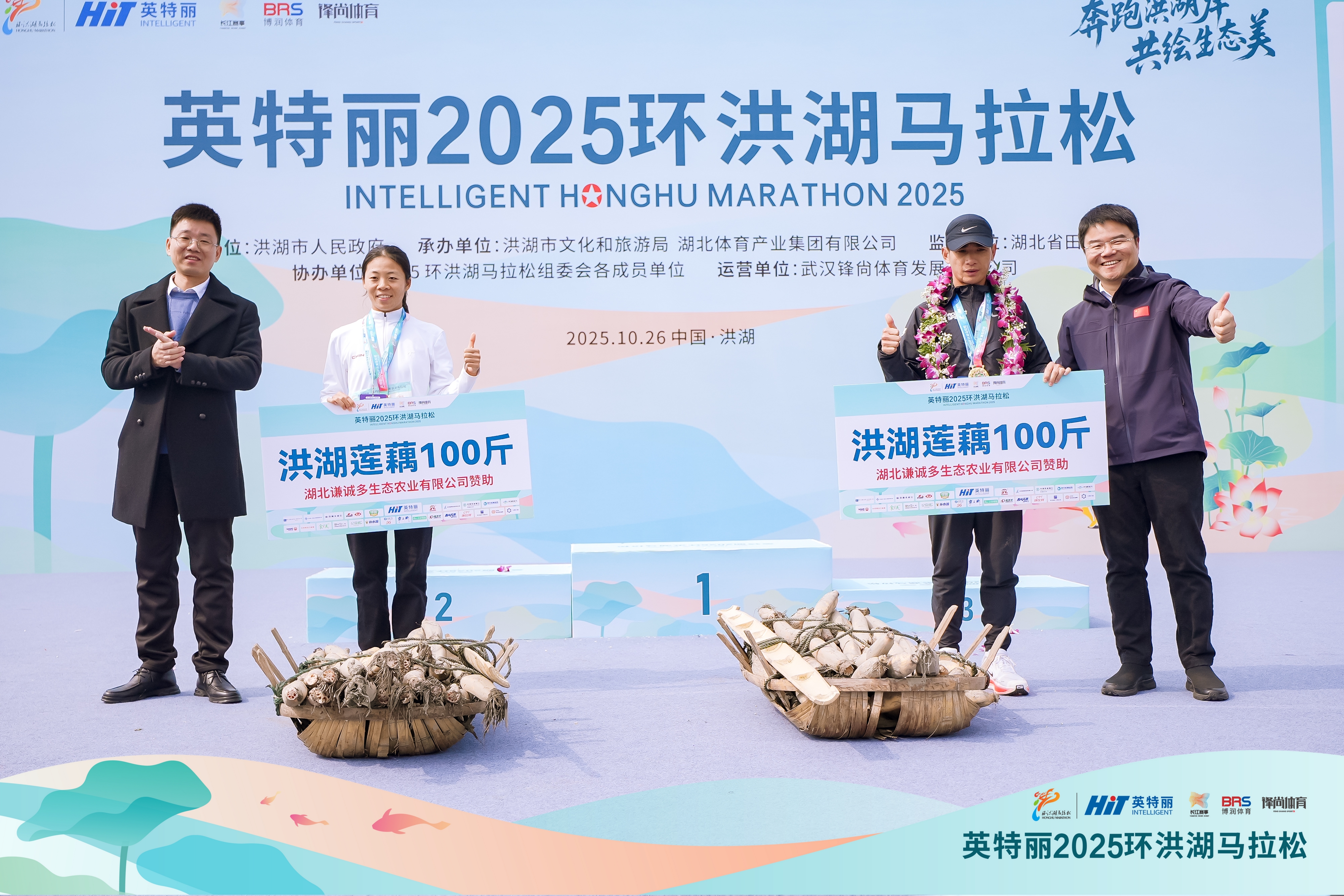 11:20 嘉宾崔巍、杜智为全马男、女冠军颁发特别奖项——洪湖特色奖品(100斤莲藕/人)颁奖。