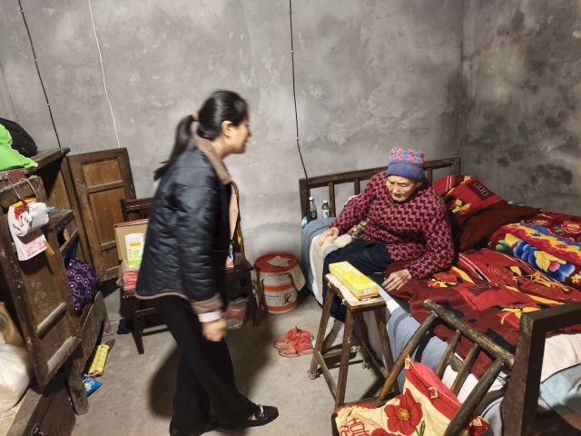 活动结束后,针对村内行动不便未到场的老人,花园村志愿者们带着慰问品上门走访。在83岁的周光凤老奶奶家中,志愿者陪老人聊天解闷。周奶奶拉着志愿者的手说:“谢谢你们记着我,还来看我,心里真暖和。”