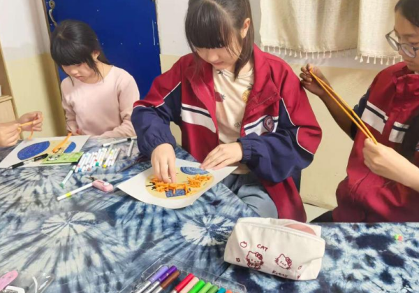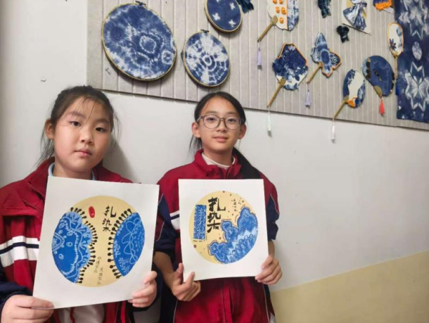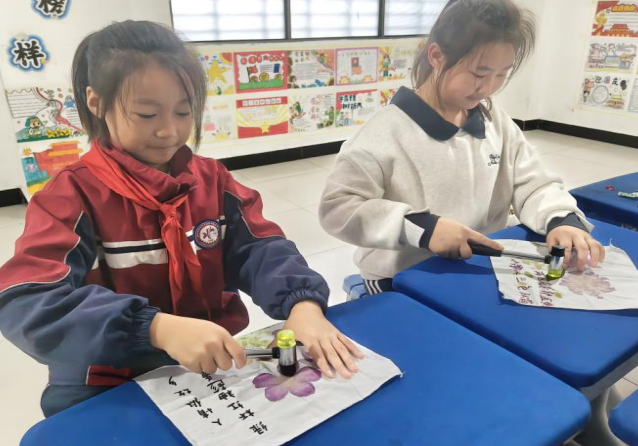扎染学堂内,蓝白布料与秋日菊影碰撞出独特美感,孩子们以菊花为灵感背景,通过捆扎、浸染等技法,让布料晕染出如菊瓣舒展、如秋意朦胧的纹理,每一件独一无二的扎染作品,都是对重阳文化的创意表达。此外,部分班级还组织学生制作了手写贺卡,将心底的感恩与祝福化作一句句温暖的话语,准备送给家中长辈,让敬老之情从校园延伸至家庭。