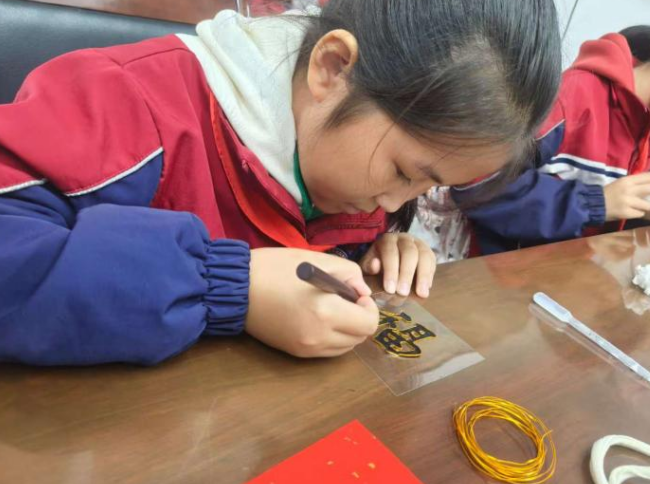 掐丝珐琅学堂中,金属丝与彩砂相映成趣,同学们专注地勾勒、填色,将“福”字的笔画细细掐出,再填入鲜艳彩砂,一枚枚精致的珐琅“福”字逐渐成形,既是对传统工艺的初探,更将对长辈的“福寿”祝福凝于作品之中。
