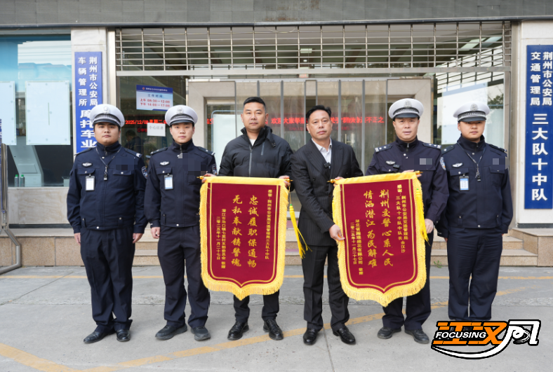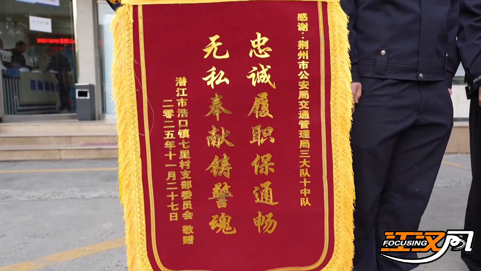 12月2日上午,伤者所在工厂的负责人与村党支部书记专程从潜江赶到荆州,将两面饱含感激与敬意的锦旗,送到三大队交警手中。