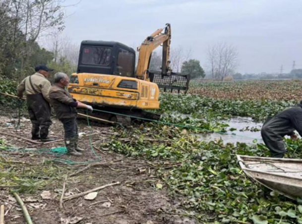 对此,东升镇党委、政府高度重视,经集体研判制定“清理+补水+净化”综合治理方案,多方筹资委托专业机构推进整治。通过“人机协同”模式,人工布设拦网聚拢水草,长臂挖机专用挖斗集中打捞,累计投入机械作业120小时、人工50人次,清运水草30余吨。