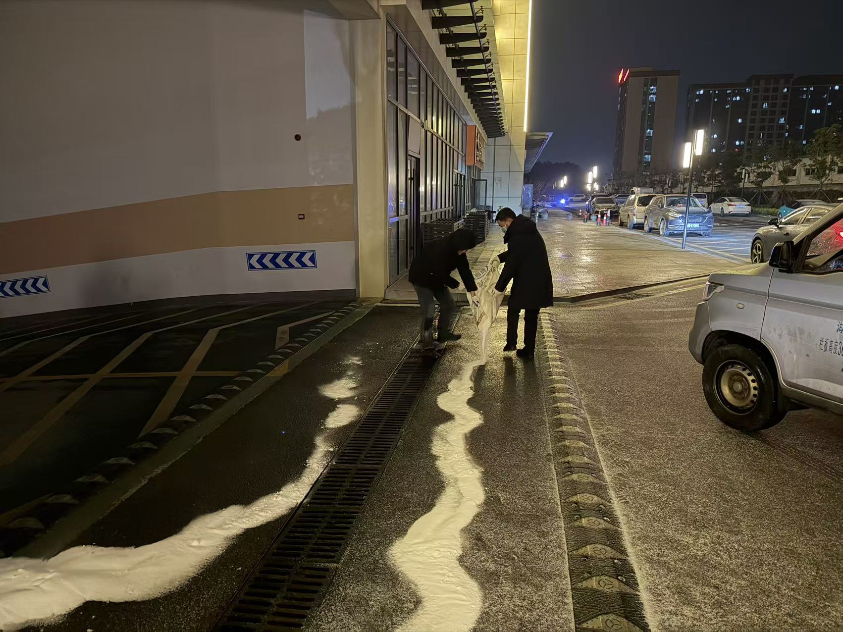 荆发控股集团针对重点区域精准施策,组织人员对美的配套产业园主道路进行铺洒融雪剂;对荆开广场、曙光公寓及地下停车场入口铺洒融雪剂,在广场二楼商铺平台、公寓入户大堂铺设防滑地毯;深入在建项目生活区开展安全巡查,消除雨雪天气带来的安全隐患。