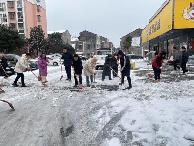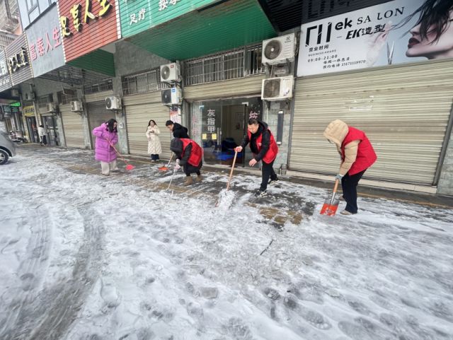 荆州区城南街道御河社区党委第一时间启动应急响应,早上8点,社区党员先锋队已集合完毕。社区书记带头,党员们手持铁锹、扫帚,向积雪最厚、结冰最严重的区域发起“进攻”。铁锹与冰面碰撞的铿锵声,在早上格外响亮。他们顾不上冻红的双手和浸湿的鞋袜,埋头苦干,只为尽快开辟出一条“安全通道”。