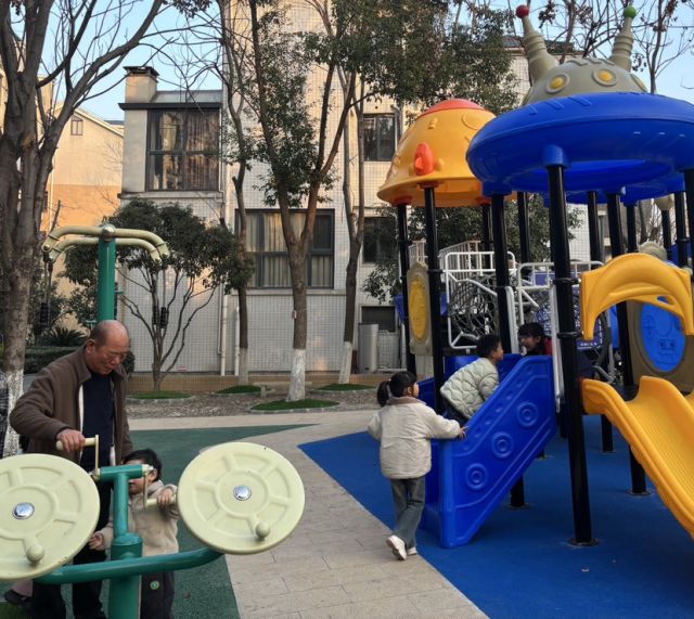为民办实事,精准改造解民忧,是休闲驿站焕新的核心要义。项目全程锚定居民“急难愁盼”,以“便民、利民、惠民”为出发点推进建设,完成广场地面水泥硬化与透水石铺设,彻底解决积水坑洼痛点;新增适配老年人的健身器材、专属儿童游乐设施,平整场地也成为邻里休闲优选。如今广场上,孩童攀爬嬉戏、家长惬意照看、老人健身闲谈,全龄群体各得其乐,暖意融融。