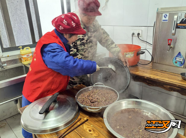 另一边,熬粥区域香气四溢。志愿者们按照老人传授的方法精心熬煮腊八粥,咕嘟咕嘟的粥声传递着温暖。等待间隙,趣味运动环节让老人们活动了筋骨,现场笑声不断。