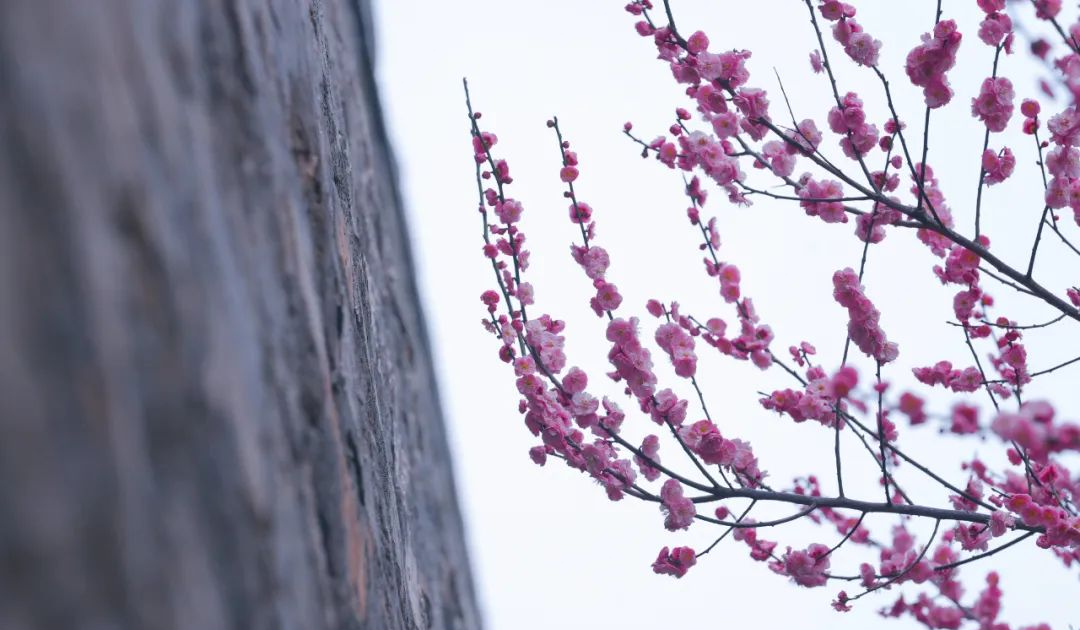梅花的影子落在斑驳的城墙上