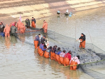55亩的鱼塘内,渔民们穿着水裤,插竿布网,一边吆喝,一边不停地拉动着手中大网。随着渔网被越收越紧,一尾尾肥硕的青鱼翻腾跃动,搅活一池冬水。渔民们穿梭在塘间,娴熟地将鱼装入袋中,并通过吊车将鱼转到运鱼车上。