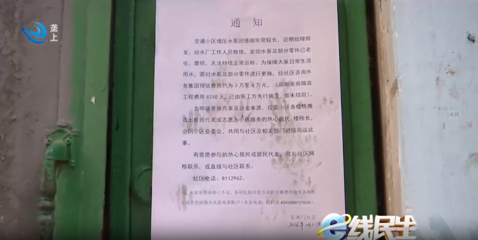 石闸门社区党委书记、居委会主任 叶珊珊:泵房存在的问题,我们也出了两个方案,第一个就是全部换新,换新的费用大概预算在两万元左右,第二个就是进行设备的维修,维修费用在一万左右,这个费用可能就是要请居民们来一起协商,选择哪一种方案,然后每家每户摊多少钱,以及后期费用的收缴问题,也邀请大家一起拿个主意。