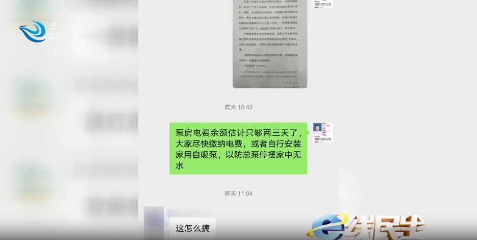 叶珊珊表示,对于居民诉求社区一直在积极推进,连续在居民群里发出缴费通知,每栋楼的单元门口也都贴了公告,工作人员上门沟通缴费事宜。叶珊珊说,电费收不齐,主要是两方面原因。一方面,有些居民缴费不积极,总想着拖一拖,还有部分业主觉得自家没用增压泵,就不愿意缴纳电费。对于居民提出的设备维修问题,叶珊珊也给出了答复。