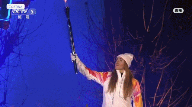 在科尔蒂纳,意大利女子高山滑雪运动员戈贾点燃另一座主火炬台。
