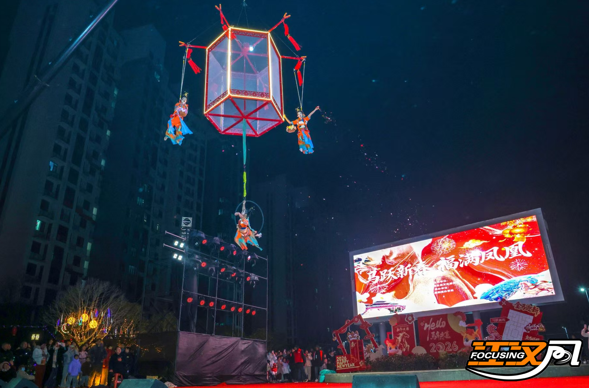 夜幕降临,贺岁文艺展演在众人期待中精彩启幕。《打大鼓》《五虾闹鲇》与宫灯飞天秀率先点燃氛围。巨型古典宫灯遇上敦煌飞天舞,高空杂技的硬核技艺,与胡旋舞的婉约美感结合,赢得现场掌声阵阵。随后,奔腾激昂的《布马舞》、活力四射的街舞《闹新春》、雅致婉约的双伞舞《惊弦》、妙趣横生的魔术《魔幻科学实验室》等节目轮番上演,独唱《荆州荆州》《心有归处便是家》深情诉说乡愁与温情,引来掌声不断,宛如一场“家门口的春晚”。
