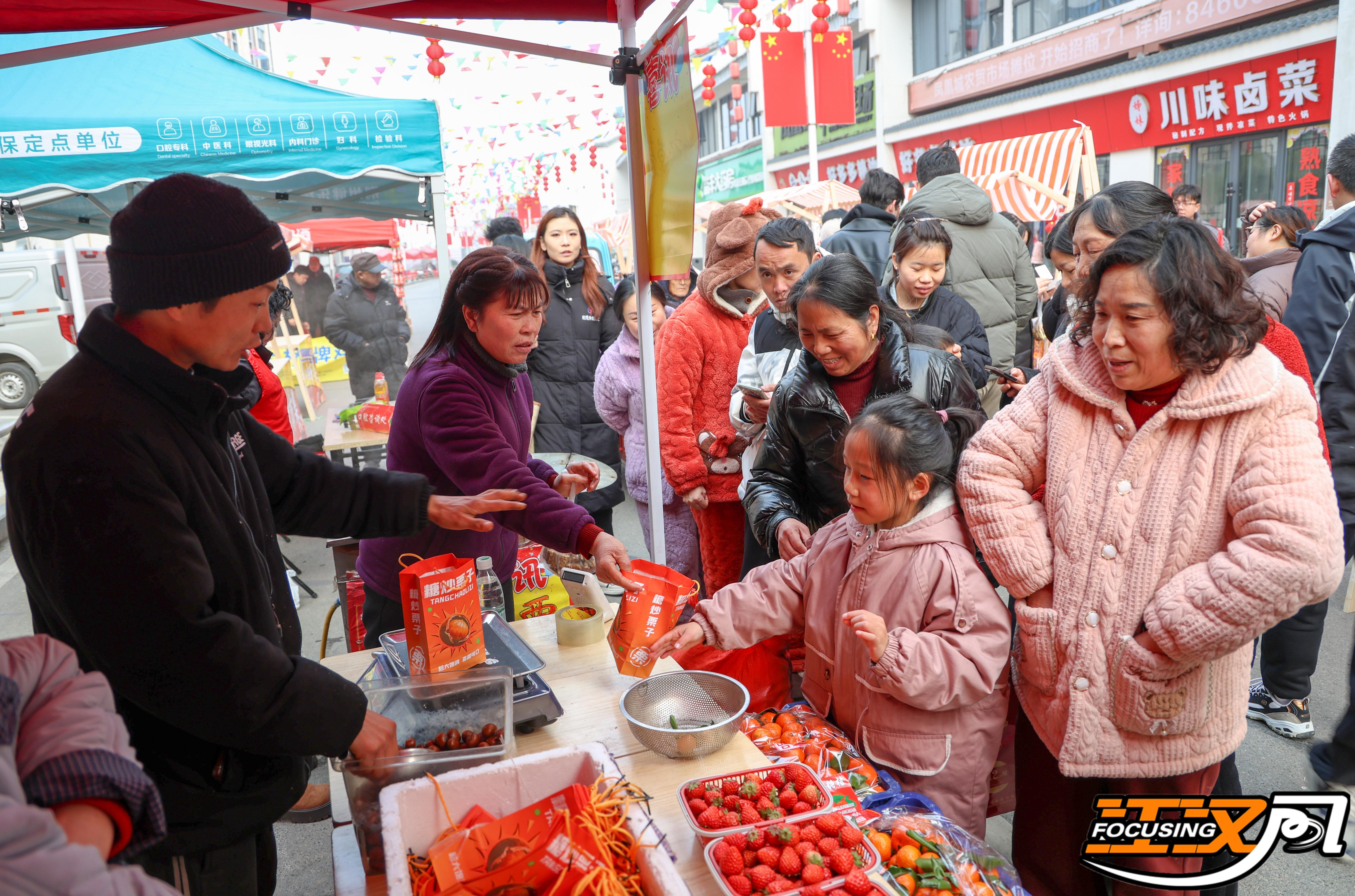 当天下午,新春年货市集热闹开市。文旅街区两侧摊位林立,荆楚特色土产、手工好物、传统小吃琳琅满目。居民们穿梭其间,精心挑选春联、干货、点心等,空气中弥漫着糖画甜香与炒货焦香。“不用跑远,这里啥都有!”带着孩子前来采购的王先生满意地说。