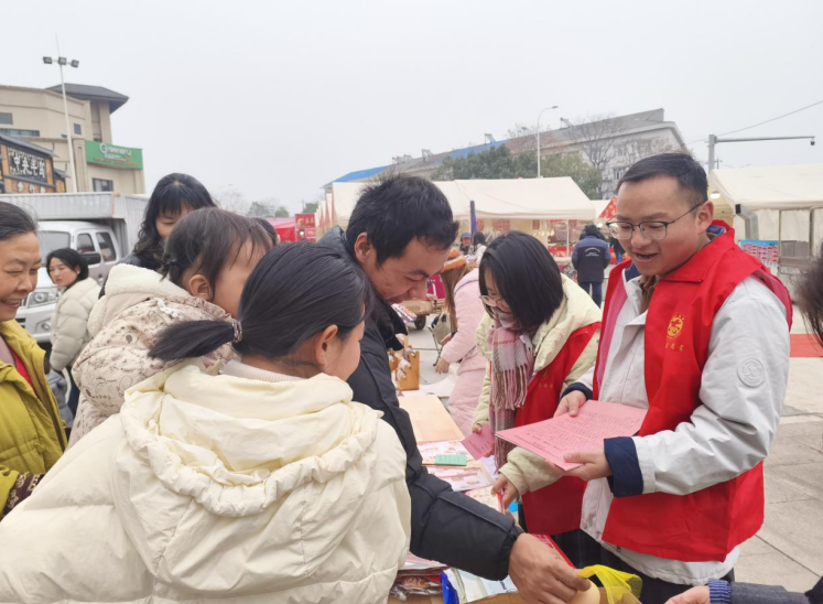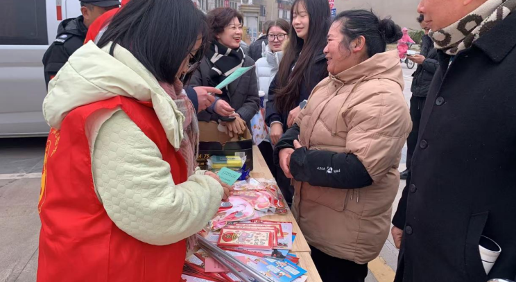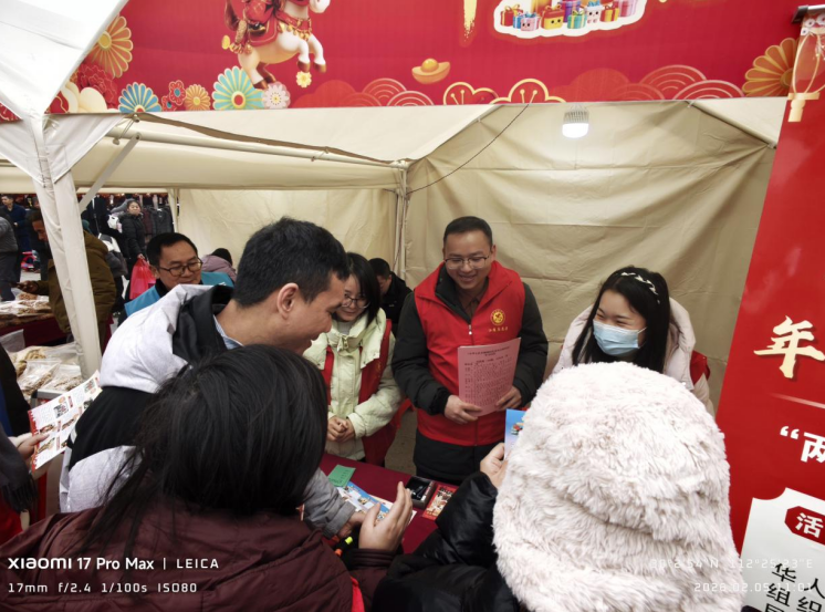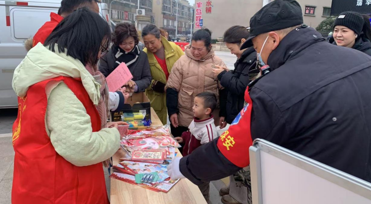 年货市集内,将普法与新春年货节有机结合,设置专属普法互动区,以“答题闯关赢福礼”为核心,工作人员用通俗语言出题,题目均源自“两法”,聚焦村(居)“两委”职责、居民选举权等群众切身相关知识点。参与群众答题正确可领取实用奖品,答错后志愿者当场讲解重难点,确保学懂弄通;同时现场发放“两法”宣传折页,让群众在逛市集、领奖品中潜移默化学习法律知识。