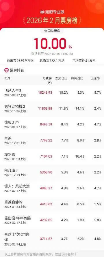 2026年2月票房破10亿元 2026-02-16 13:28 界面新闻 0 据猫眼专业版数据,2月16日11时,2026年2月总票房破10亿,《飞驰人生3》《疯狂动物城2》《惊蛰无声》分列2月票房榜前三位。