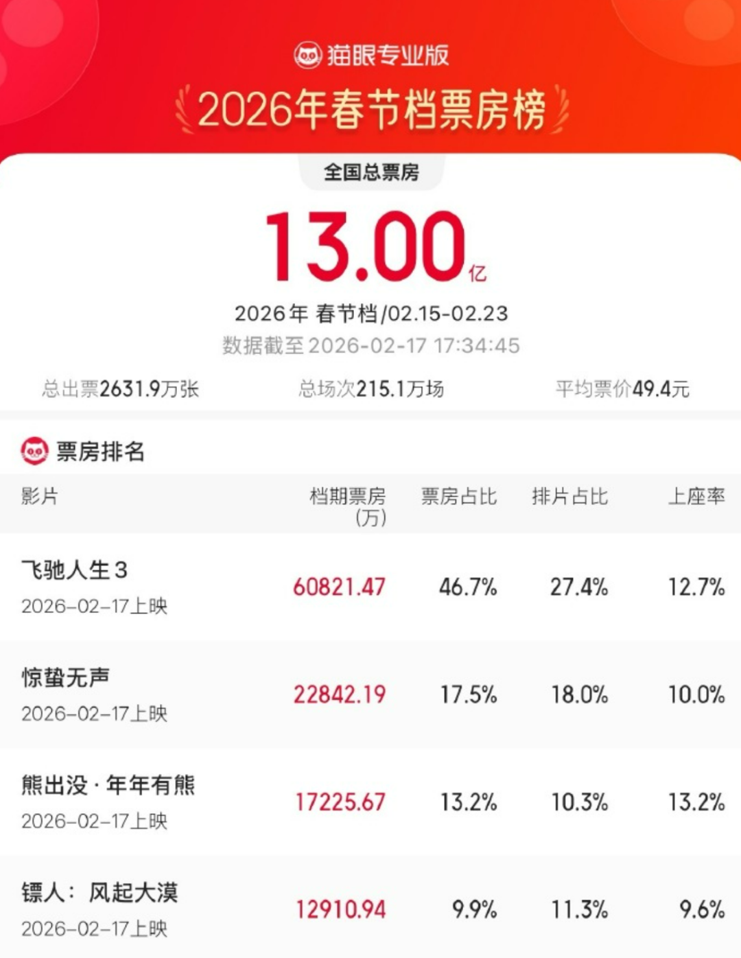 目前,沈腾主演的影片《飞驰人生3》正在热映中,截至2月17日17时34分,影片《飞驰人生3》票房突破6亿。