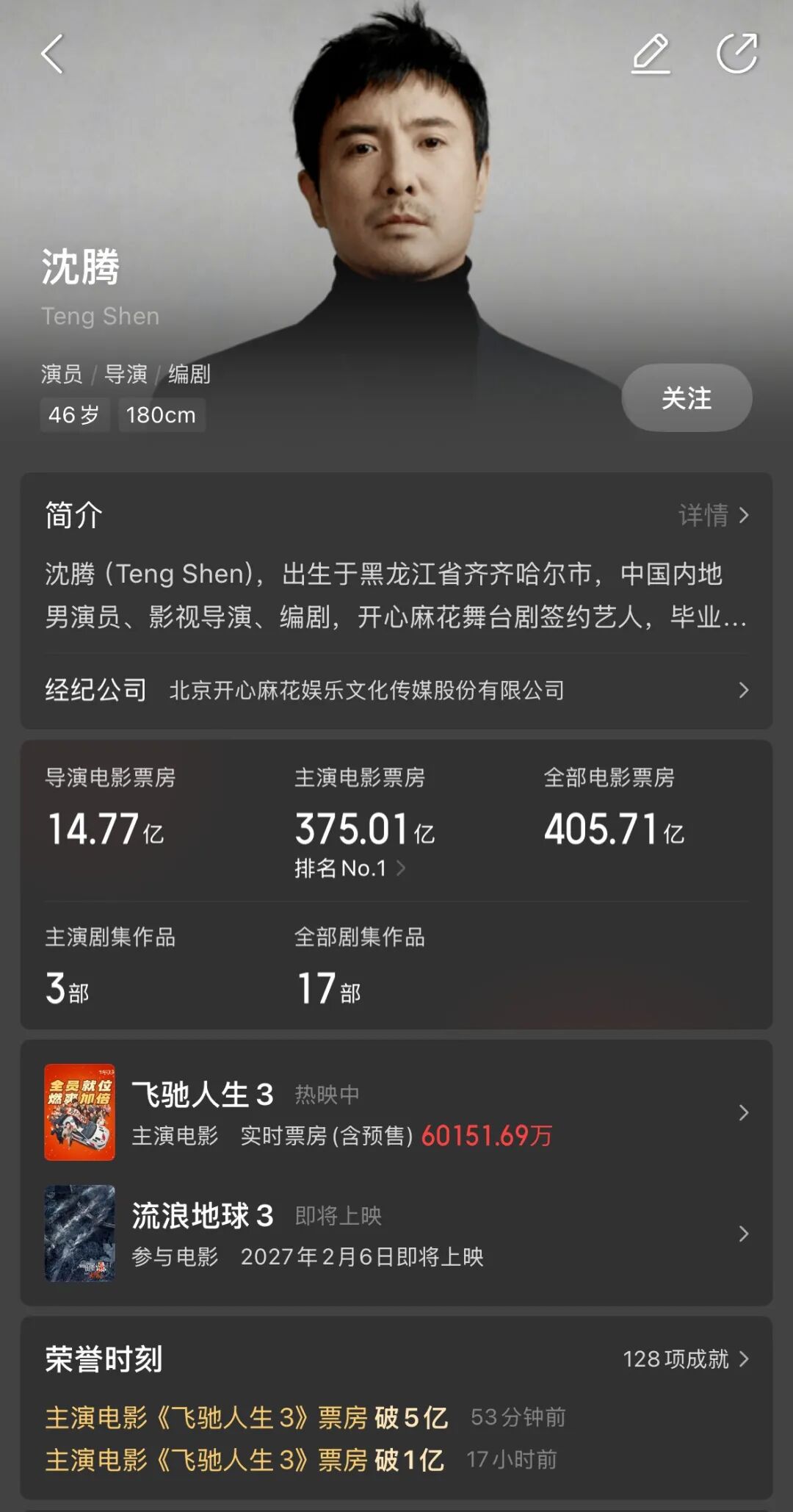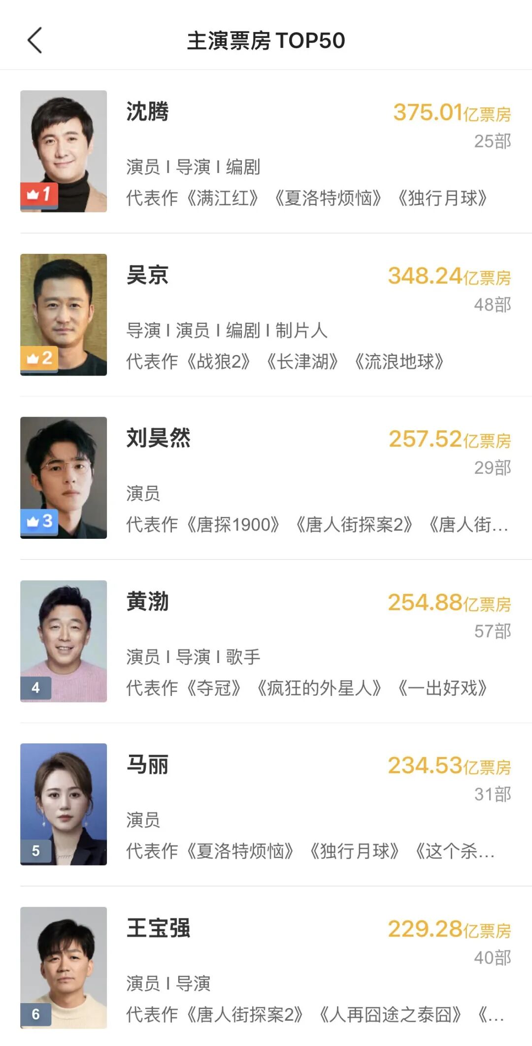 根据猫眼专业版统计数据显示,沈腾能荣登榜首,最重要的“功臣”作品有4部,分别是《你好,李焕英》(54.13亿)、《满江红》(45.44亿)、《飞驰人生2》(33.98亿)和《独行月球》(31.03亿)。在这些票房30亿+作品的加持下,沈腾的个人总票房在过去几年间飞速上涨,最终成为新一任“冠军”。