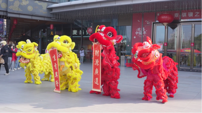 大年初一上午9时58分,在荆州吾悦广场外,伴随着铿锵有力的锣鼓节奏,几头身披金红鳞甲的瑞狮腾挪跳跃,开门送福。