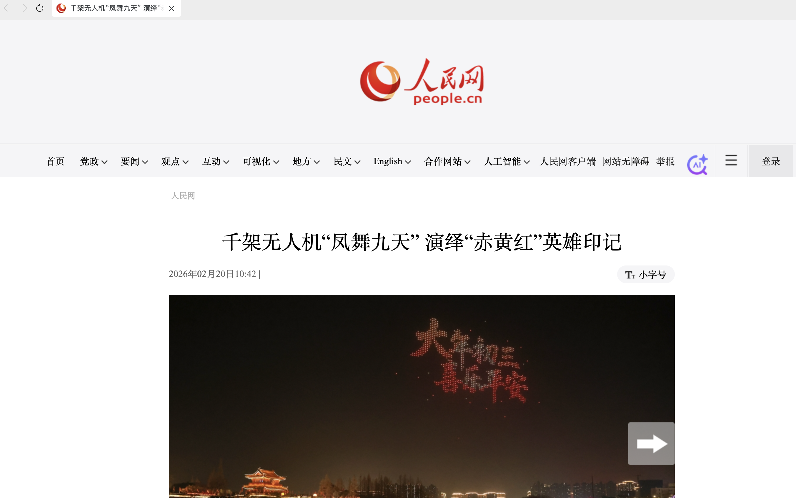 2月20日,人民网客户端刊发文章《千架无人机“凤舞九天”,演绎“赤黄红”英雄印记》,报道荆州古城千架无人机如星河般,从古城墙畔腾空而起,“凤舞九天”光影秀在古城东门震撼上演,以天为幕、以城为景,实现古老城墙与硬核科技同框。