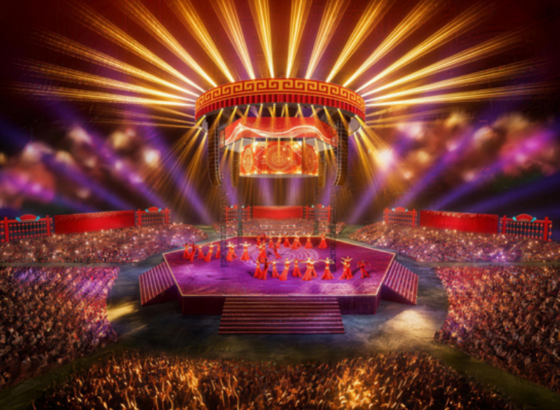 活动舞台以“凤凰羽翼环抱,走马灯映元宵,天地水三维立体展演”为设计理念,设360°全域观演圆形舞台,搭配环形走马灯大屏、天地水联动特效、威亚系统及无人机编队,实现“人在灯中坐,灯随景流转”的沉浸式观演体验。