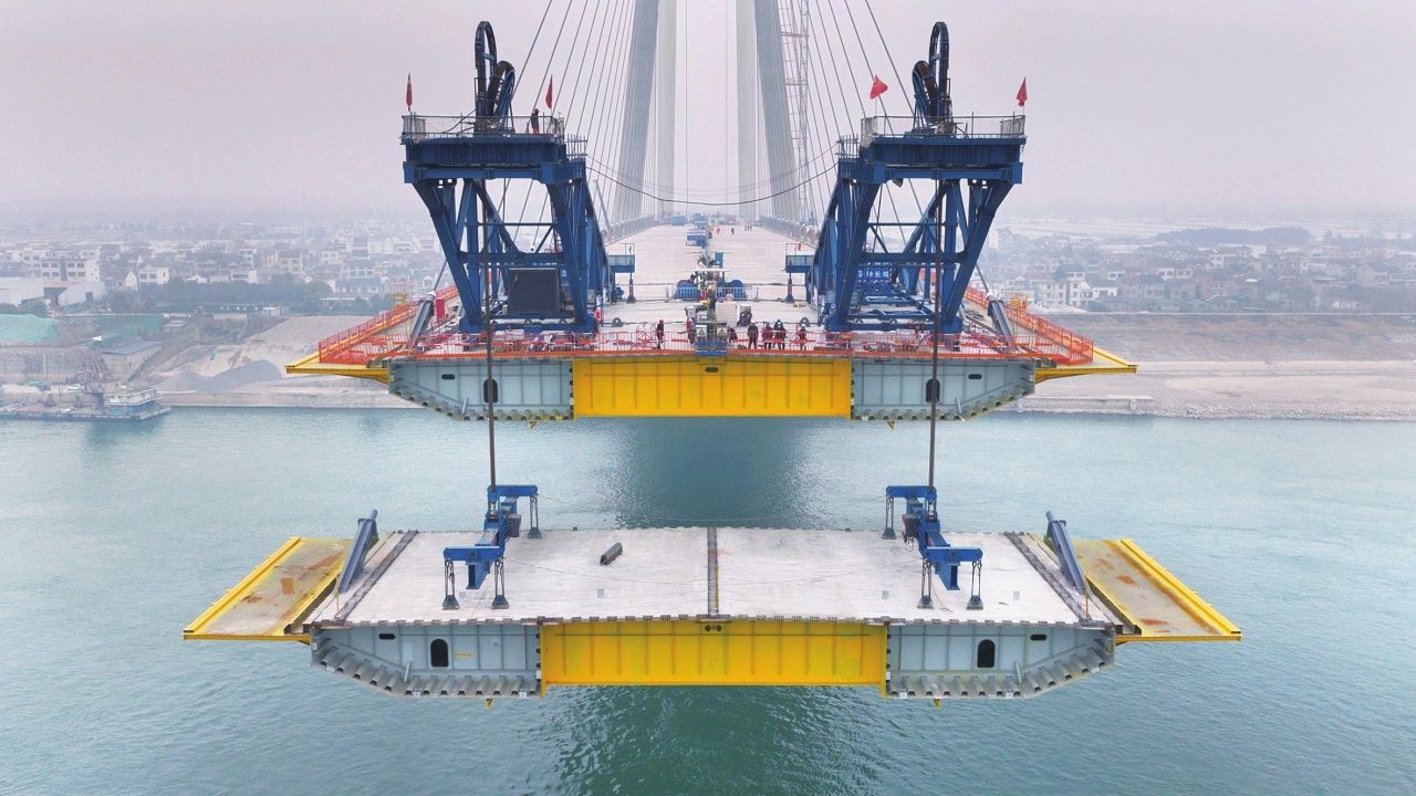 2月5日,枝江长江大桥北岸迎来中跨第25片UHPC钢混组合梁吊装施工(记者 谭杨晨雷 摄)