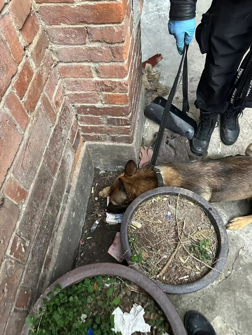 时间一分一秒流逝。约10分钟后,“安安”突然在院子北侧墙角的一排花盆前停下,低头反复嗅闻,随即卧倒示警——这是训练有素的“发现信号”。