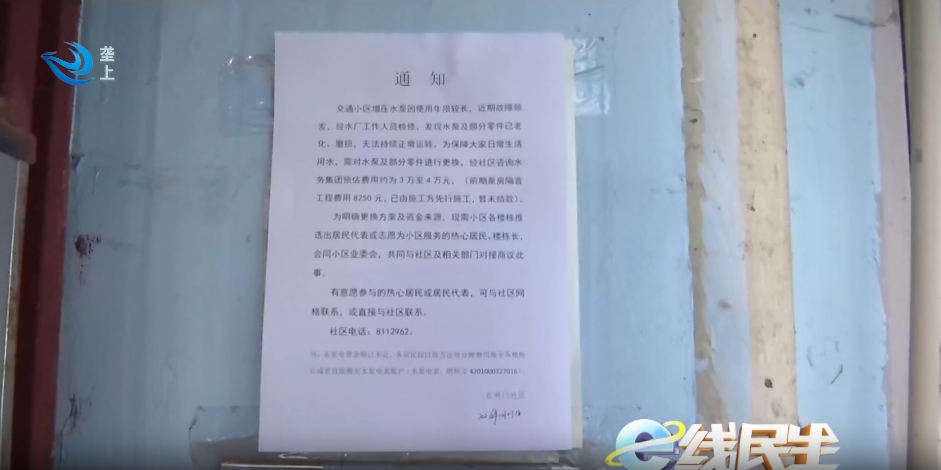 交通小区居民 皮冠云:社区也是出了个通知发在群里,当时一出通知第二天我们这栋楼就全部交齐了,春节前几天我们就先从交了的钱里面拿了两千块钱出来,到现在为止,因为电费交了一部分钱,电就不可能停,不停电供水就正常了。