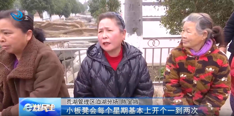 荒湖管理区泊湖分场 陈金娥:小板凳会每个星期基本上开个一次到两次,每个礼拜三都要开一次的。