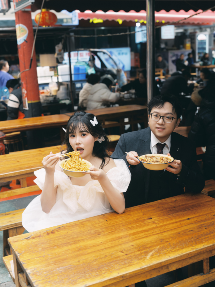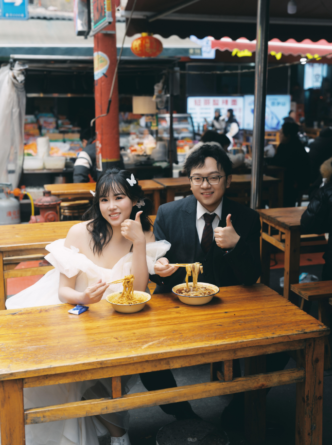 新娘 刘雯:“拍婚纱照的那天,路过的每一个人都对我们投来了善意的目光,卖臭豆腐的姐姐还给我们放了一首【今天你要嫁给我】,让我印象很深刻。”