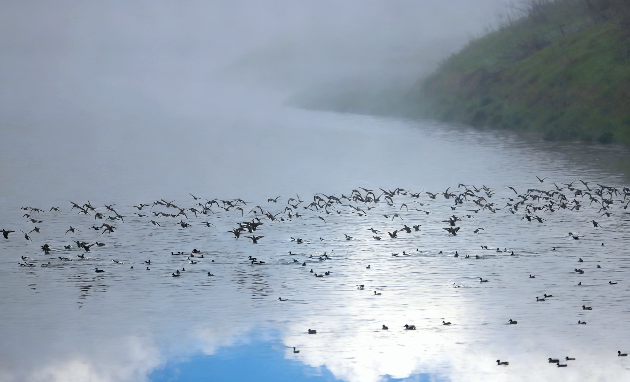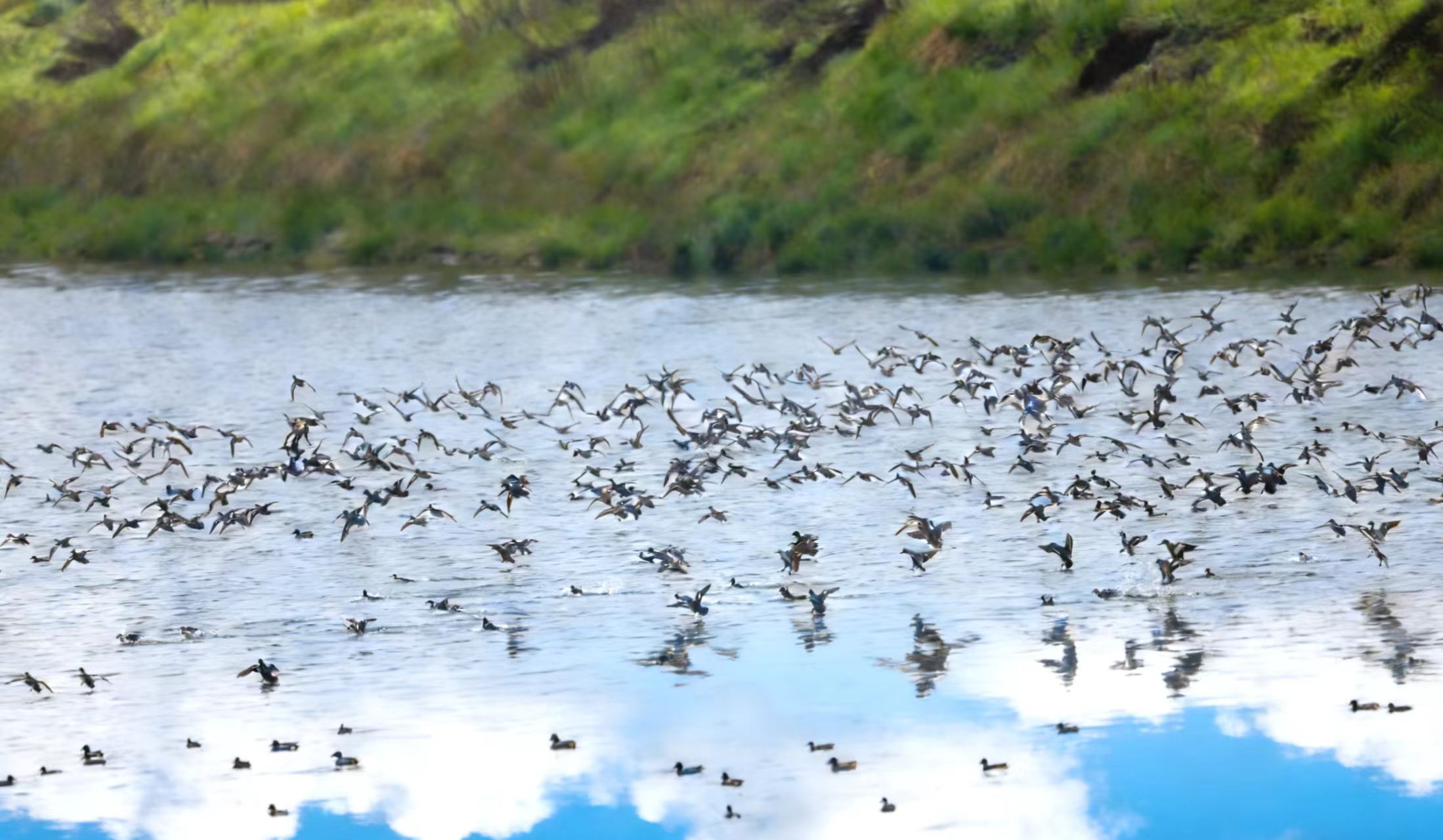 附近的村民说:“河里一下子聚集了上千只野鸭,真少见!”