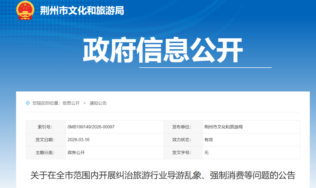 为进一步规范我市旅游市场秩序,切实保障广大游客的合法权益,提升我市旅游形象,依据《中华人民共和国旅游法》《旅行社条例》《导游人员管理条例》等相关法律法规,荆州市文化和旅游局即日起在全市范围内开展纠治旅游行业导游乱象、强制消费等问题专项行动,现将有关事项公告如下:
