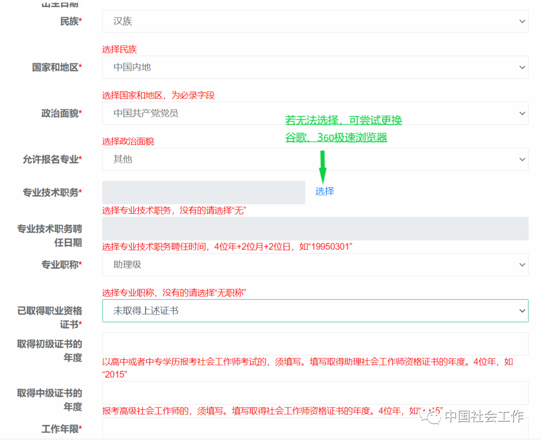 (12)工作年限必须大于等于专业年限。这里的专业年限是指从事社会工作的年限,需要符合之前选择的报考条件。如,报考条件选择“取得其他专业大专学历,从事社会工作满4年”,就必须填写不少于4年的专业年限。