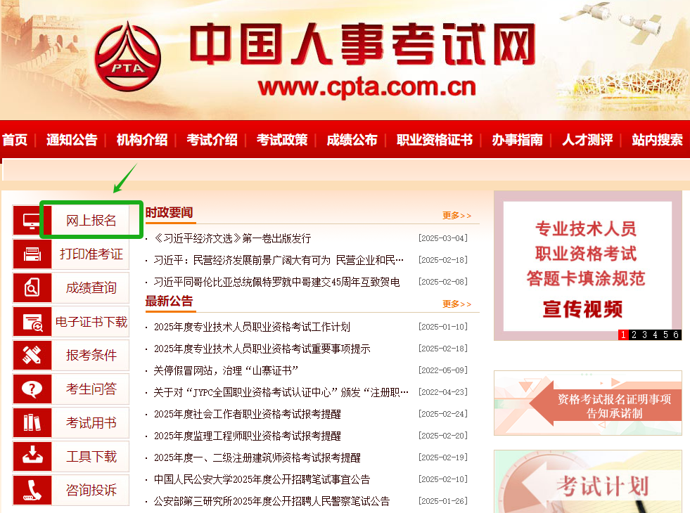 第一步:打开官方报名入口“中国人事考试网”(http://www.cpta.com.cn/),点击“网上报名”。